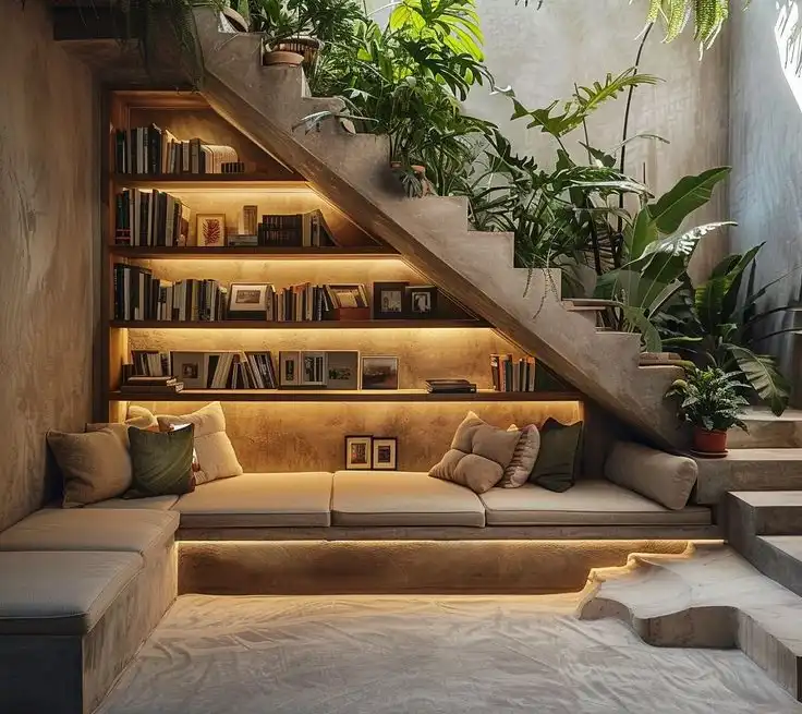 The space under the stairs often goes unnoticed. However, with a bit of creativity, this underutilized area can become one of the coziest spots in your house. By adding a soft bench or a small sofa, some cushions, and mood lighting, you can create a secret retreat that’s perfect for relaxing.